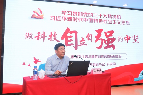 校党委副书记许安国以《学习贯彻党的二十大精神和习近平新时代中国特色社会主义思想,争做撑起中国科技自立自强的中坚力量》为主题,从“学习思想,领会精神,学深悟透党和国家新部署新要求”、“把握大势,做足准备,努力成长为科技自立自强的中坚”两个方面入手,为学员们作首场报告会。结合学习贯彻党的二十大精神和习近平新时代中国特色社会主义思想,许书记带领同学们深刻认识新时代新征程党和国家事业的新部署新要求,并重点解读了“两个确立”的决定性意义、习思想的世界观和方法论、中国式现代化推进中华民族伟大复兴、教育科技人才一体化部署等内容。同时,许书记从国际态势、国家发展、科技发展、人才发展四个维度,有理有据地深刻解析了当前总体大势,并以战略科学家为例,从强担当、开视野、重实干三个方面,勉励学员们深怀爱国之心,砥砺报国之志,朝着成为“帅才、将才”的方向努力奋斗,以青年之力,书写时代华章!